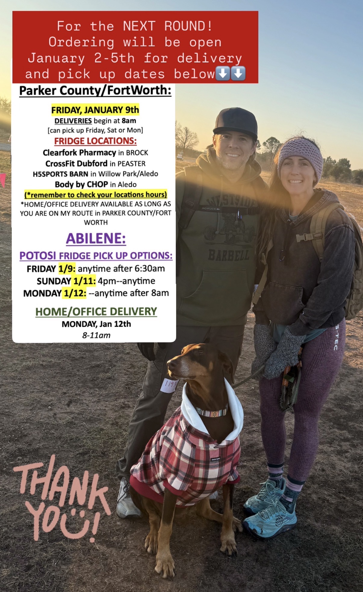 HERE IS AN ORDER EXAMPLE BELOW: for Abilene and surrounding areas AND Pick up at one of my fridge location in Parker county and/or office/home delivery. YOUR pick up/delivery preference MUST be included in your order with specific dates.